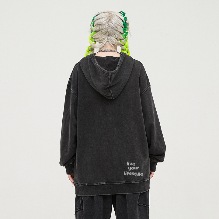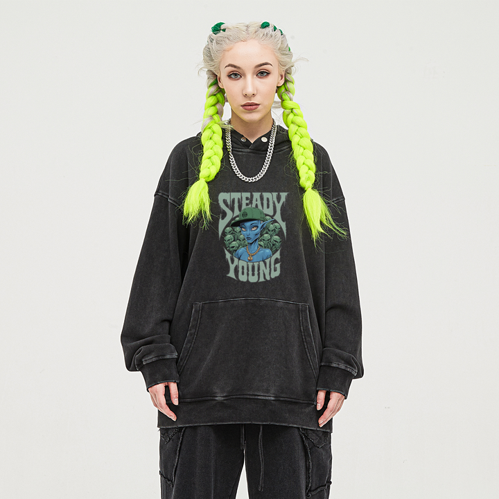 steadYYoung 380GSM Snow Wash Snap Collar Hoodie Alien